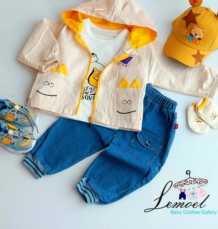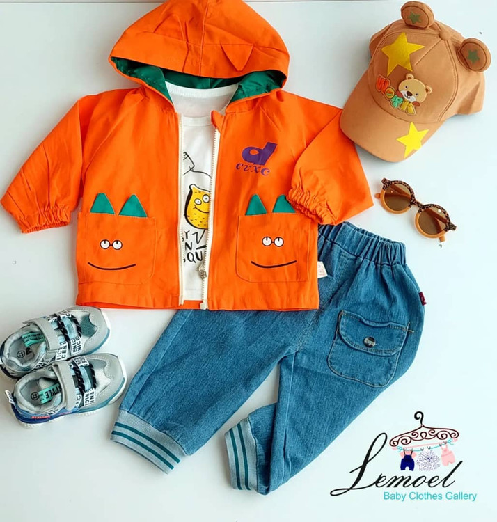 سایزبندی ۱ تا ۵ سال جنس سوئیشرت کتان و بلوز نخ پنبه و شلوار جین رنگ زمینه نارنجی و کرم